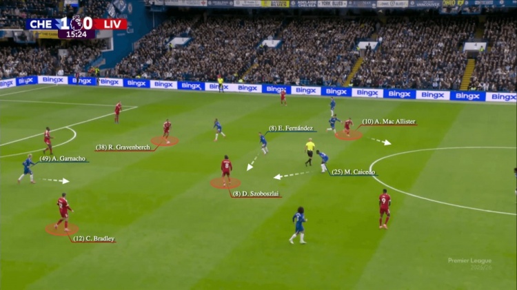 这套变化让科尔克兹得以压上,同时索博斯洛伊回撤成为科纳特的出球点。但中卫犹豫片刻后选择横传,让索博斯洛伊和布拉德利直接傻眼——此时库库雷利亚已失位,红军本可重现上赛季经典的四打三局面: