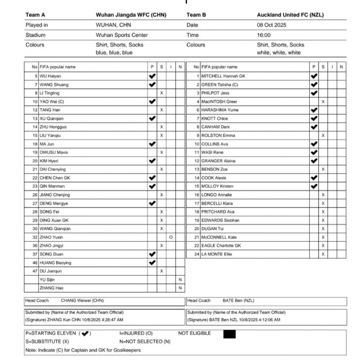 首届FIFA女足冠军杯-武汉vs奥克兰联首发:王霜、吴海燕领衔出战