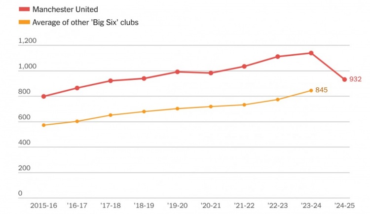 全职员工减少了18%,但与其他Big6球队比较后,拉特克利夫及其团队认为仍存在冗余空间。曼联上赛季的932名足球与行政人员数量,高于其他5家俱乐部的平均值。