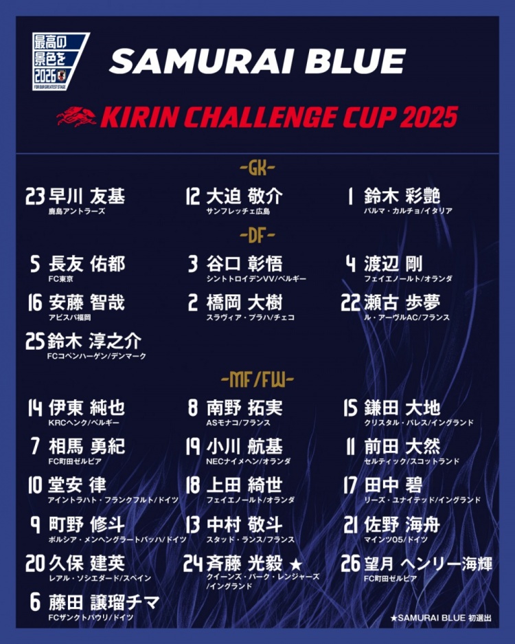 注:板仓滉、远藤航因伤退出大名单,桥冈大树递补入选。
