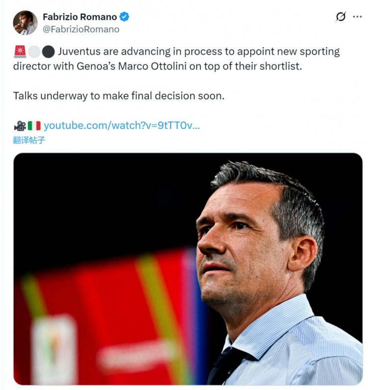 罗马诺透露,尤文正在积极推进体育总监的任命工作,热那亚体育总监奥托里尼是这一职位的头号候选。相关谈判正在进行之中,以尽快做出最终决定。