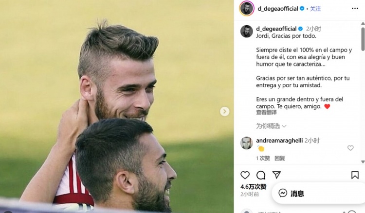 10月8日讯 不久前,德赫亚更新了社交媒体,致敬宣布本赛季结束后退役的阿尔巴,两人曾经是西班牙国家队的队友。