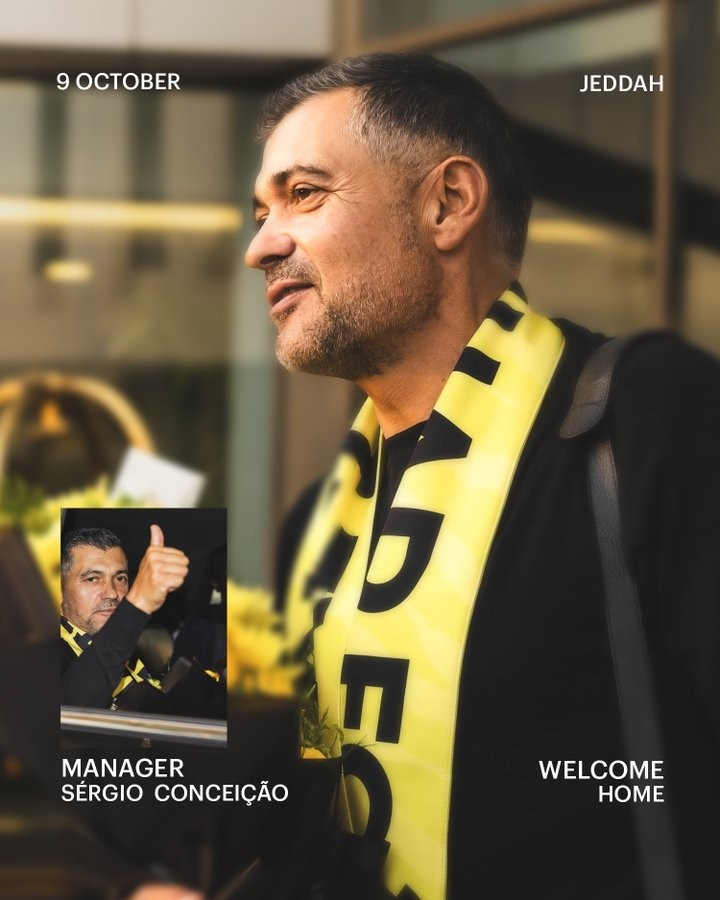 吉达联合晒出了孔塞桑及其教练组的照片,表示他们已经抵达当地,并写道:“欢迎回家。”