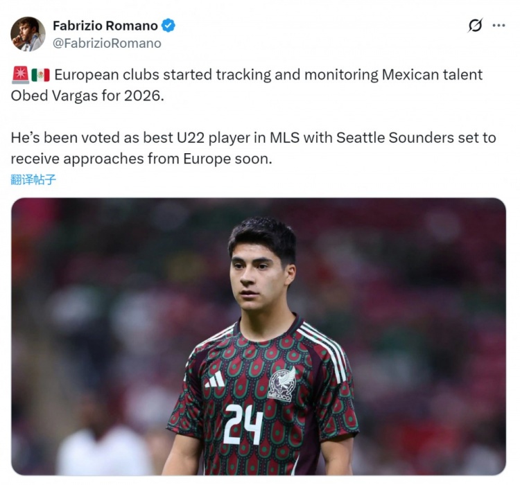 罗马诺透露,效力于西雅图海湾人的奥贝-巴尔加斯受到外界的关注,欧洲俱乐部开始追踪考察他的表现,将其列为2026年的潜在引援目标。