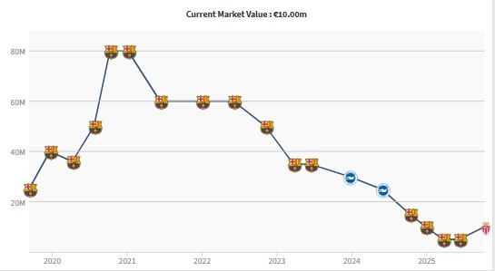 这也是法蒂近5年来首次身价上涨,在5年前他的巅峰身价曾达到8000万欧,随后一路下滑至500万欧。