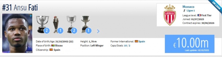 10月10日讯 德转更新了法甲的身价,摩纳哥前锋法蒂身价从500万欧上涨至1000万欧。
