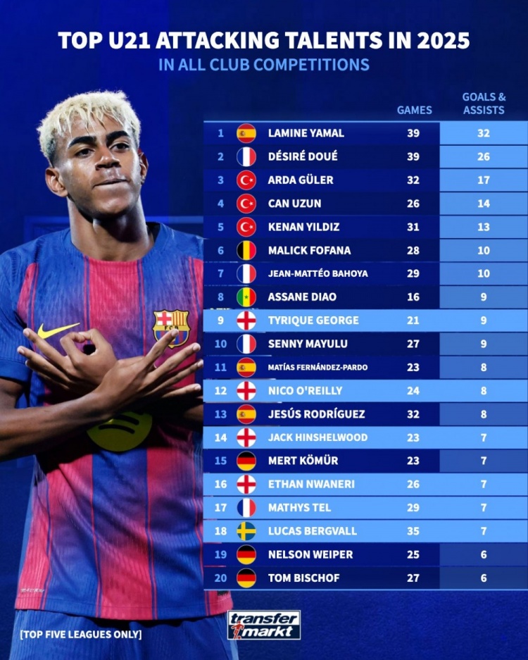 2025年五大联赛U21参与进球榜:亚马尔32球居首,杜埃26球次席