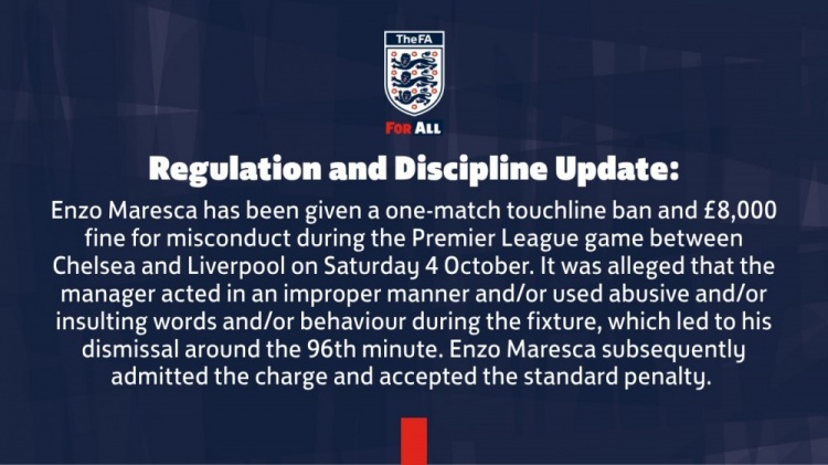 切尔西主教练马雷斯卡因在10月4日周六对阵利物浦的英超联赛中存在不当行为,被处以一场场边禁赛及8000英镑罚款。该指控指出马雷斯卡在比赛第96分钟被罚离场前,存在不当行为或使用侮辱性、攻击性言语。马雷斯卡本人已承认指控并接受标准处罚。