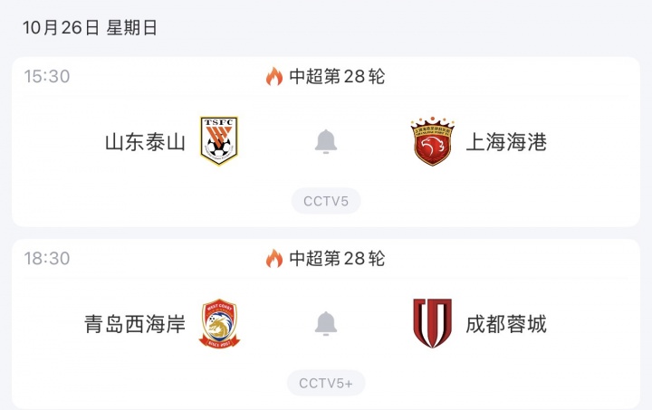 本周日海港将在联赛客场挑战泰山,落后2分的蓉城将客场挑战西海岸。