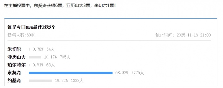 在主播投票中,东契奇获得6票,亚历山大3票,米切尔1票!