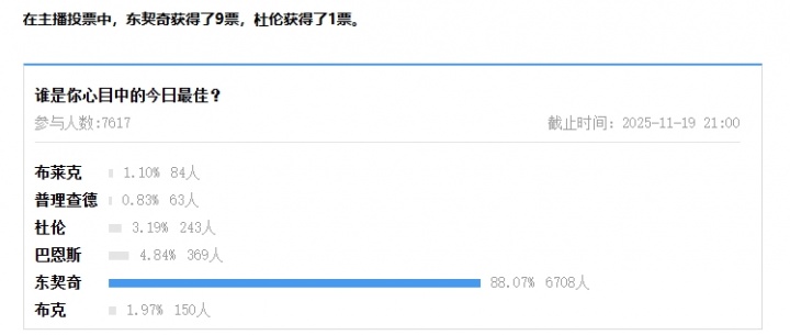 在主播投票中,东契奇获得了9票,杜伦获得了1票。