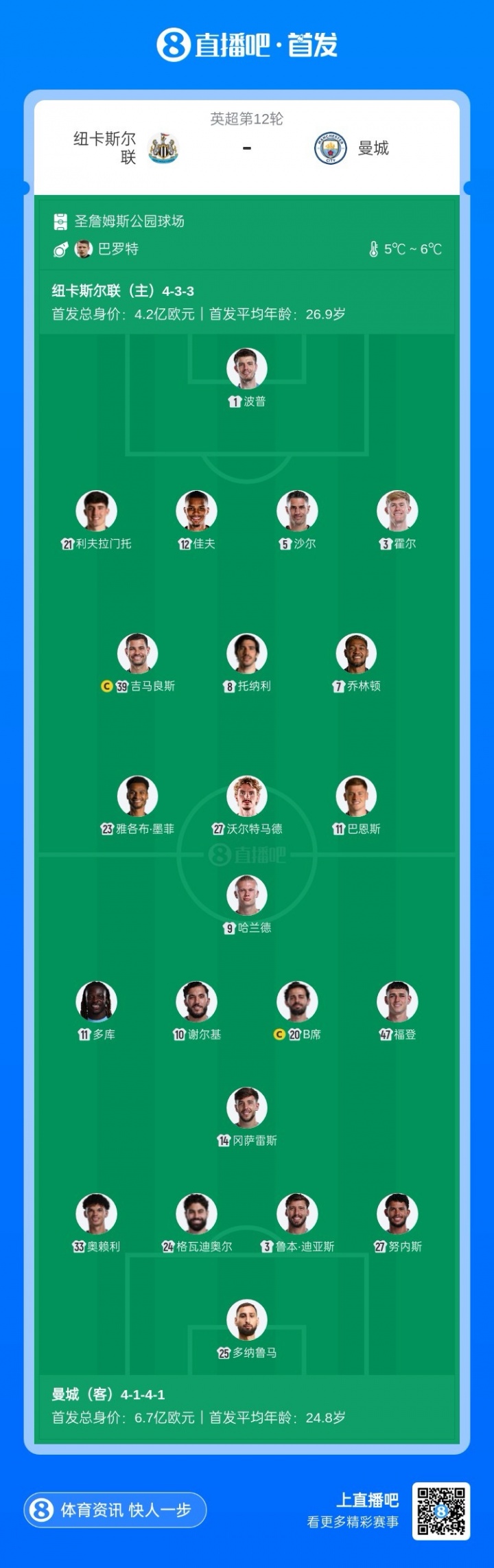 11月23日讯 英超第12轮,纽卡主场迎战曼城比赛即将打响。赛前首发出炉。本场哈兰德、沃尔特马德迎来锋线对决,曼城目前在联赛2连胜,纽卡为联赛2连败。