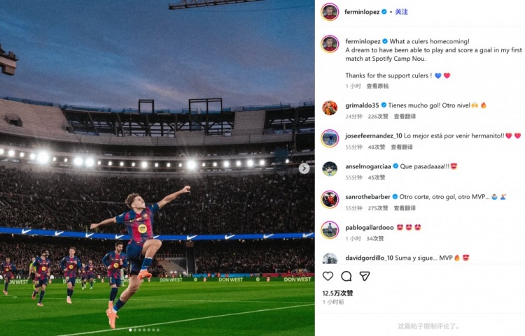 费尔明也在赛后通过社媒晒出自己的激情庆祝照,并配文:“多么精彩的巴萨回家之战!能在诺坎普球场出场并进球,简直像做梦一样!感谢巴萨球迷的支持!”
