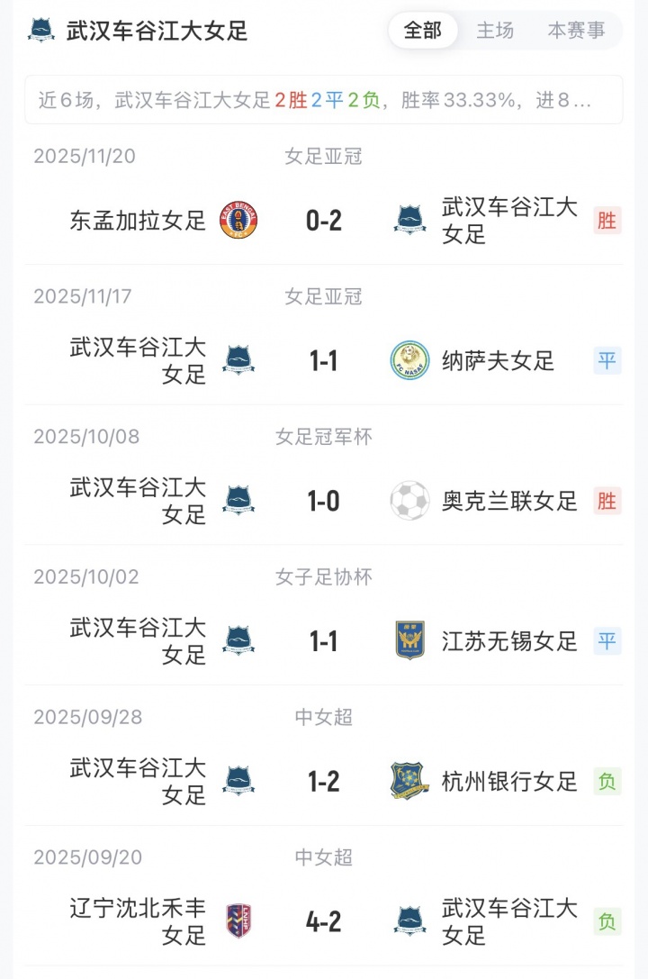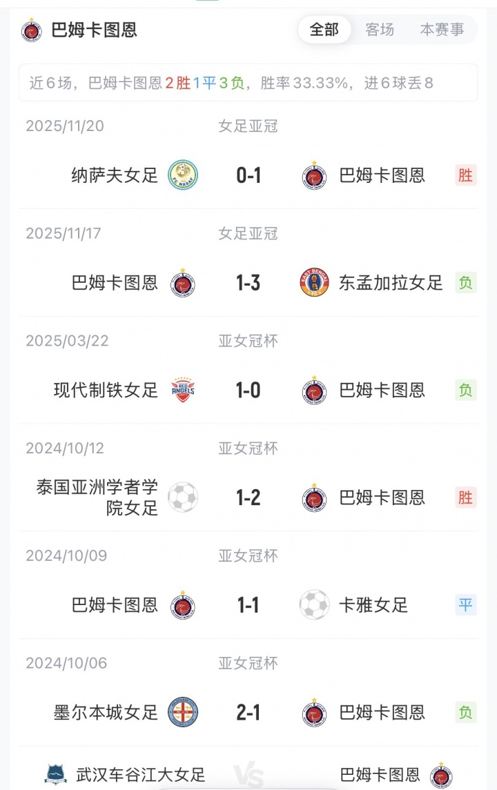 目前,武汉车谷江大女足1胜1平积4分排名B组第1,巴姆卡图恩1胜1负排名B组第3,双方暂无交锋历史。