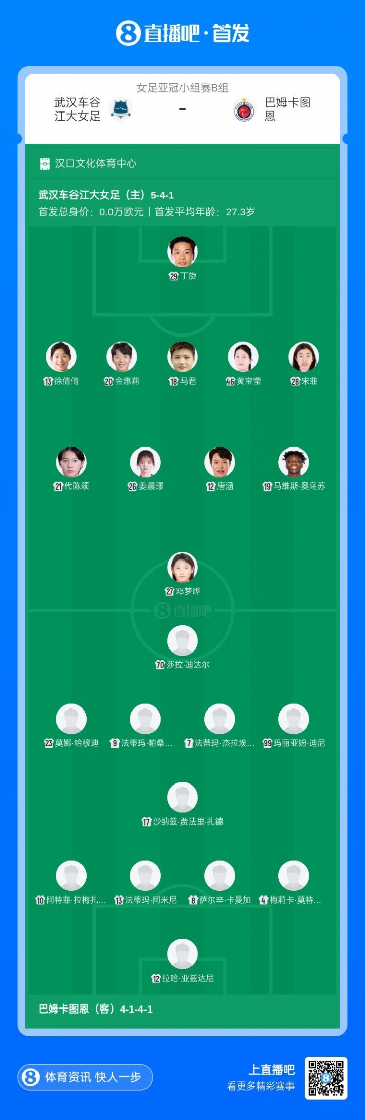 11月23日讯 女足亚冠小组赛B组,武汉车谷江大女足将在主场迎战巴姆卡图恩。赛前,双方公布了首发。