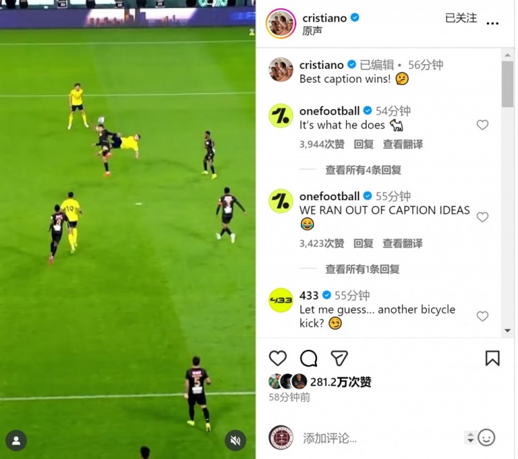 C罗赛后更新社媒动态,晒出自己倒钩破门的视频,与球迷互动:“最佳配文由你们定。”