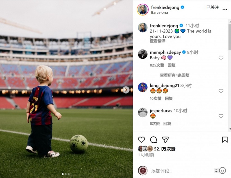 德容的儿子迈尔斯迎来2岁生日,德容社媒晒出迈尔斯在诺坎普球场的照片,配文:“2023年11月21日,这世界属于你,爱你。”