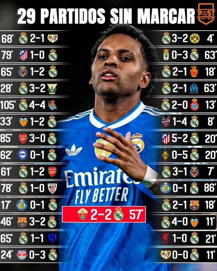 对阵赫罗纳的比赛结束后,罗德里戈的球荒延续到了30场,这让他被刻在了皇马队史的“耻辱柱”上。