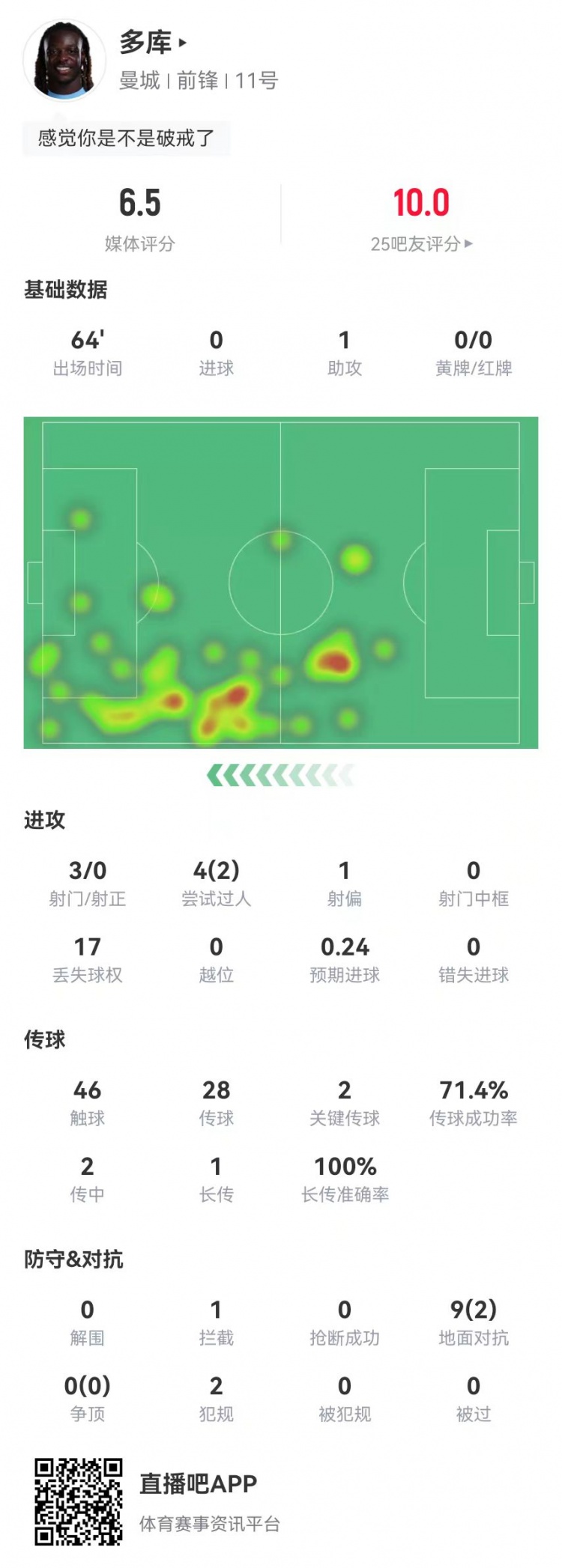 12月3日讯 曼城在本轮英超客战富勒姆,多库进球被改算作乌龙。他本场数据如下: