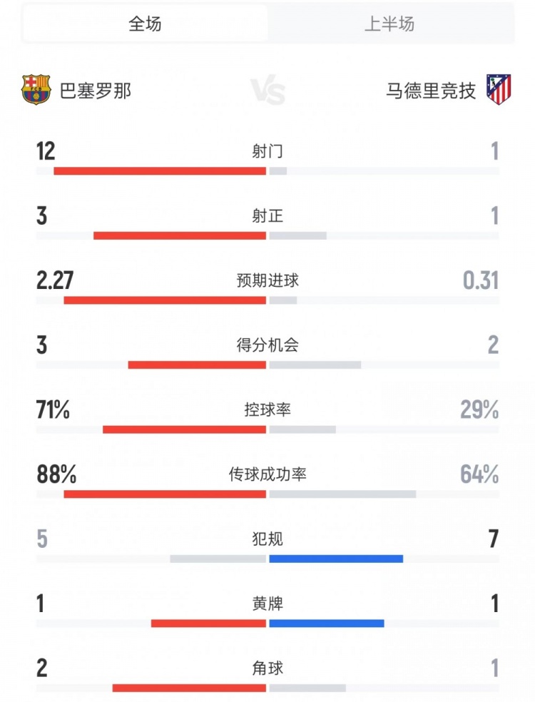 12月3日讯 西甲第19轮比赛,上半场巴萨1-1战平马竞,