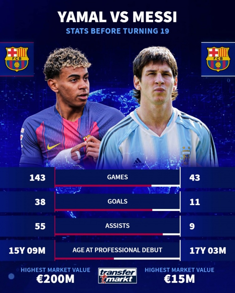 球员19岁之前数据:亚马尔38球55助,梅西11球9助,C罗6球11助