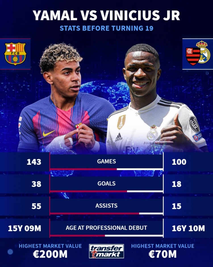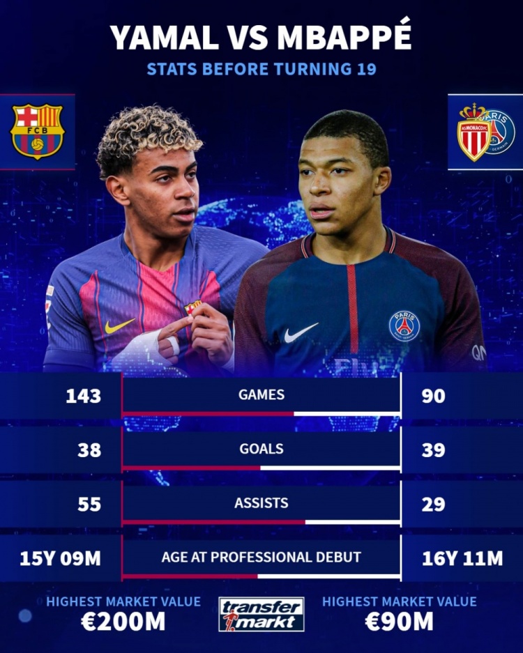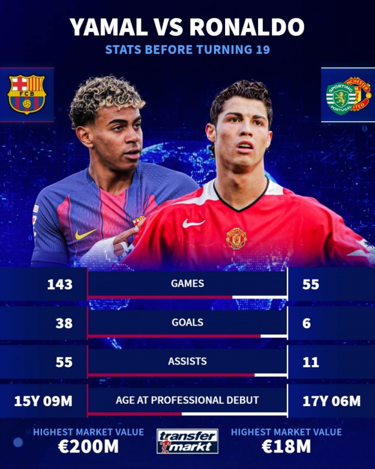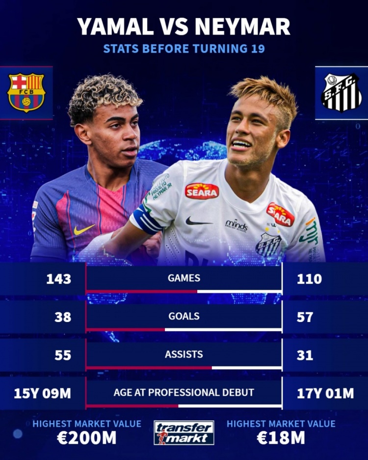12月3日讯 德国转会市场统计了亚马尔、梅西、C罗、内马尔、姆巴佩、维尼修斯19岁之前的数据,并做出对比。