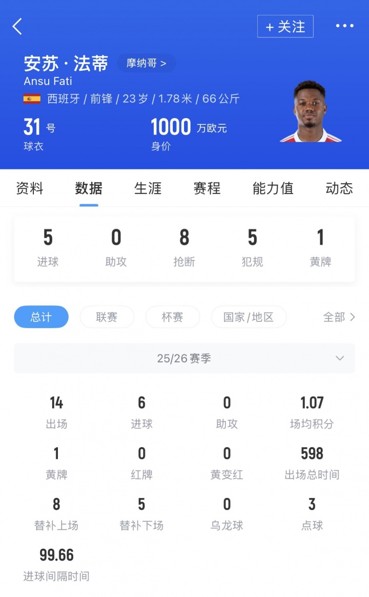 法蒂本赛季代表摩纳哥出战14场贡献6个进球,目前球队排名法甲第7。
