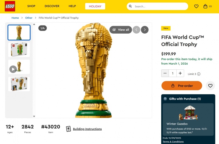 FIFA合作乐高推出1:1复刻大力神杯,预售价199.99美元