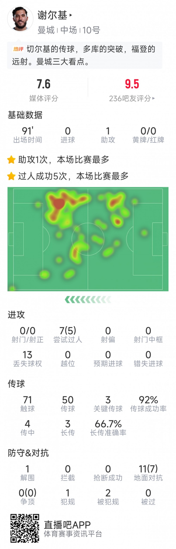 12月15日讯 在本轮英超,曼城3-0击败水晶宫,以下为谢尔基本场数据: