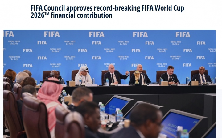 国际足联理事会批准2026年国际足联世界杯创纪录的7.27亿美元财务分配方案,较2022年世界杯增加50%。