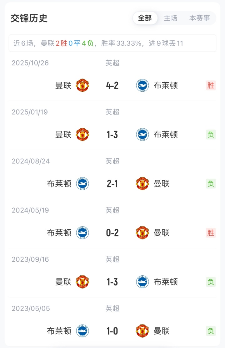 曼联联赛8胜8平5负积32分暂位英超第7,目前已遭遇三连平,近6场仅1胜;布莱顿联赛7胜8平6负积29分位居英超第11,近8场仅1胜。