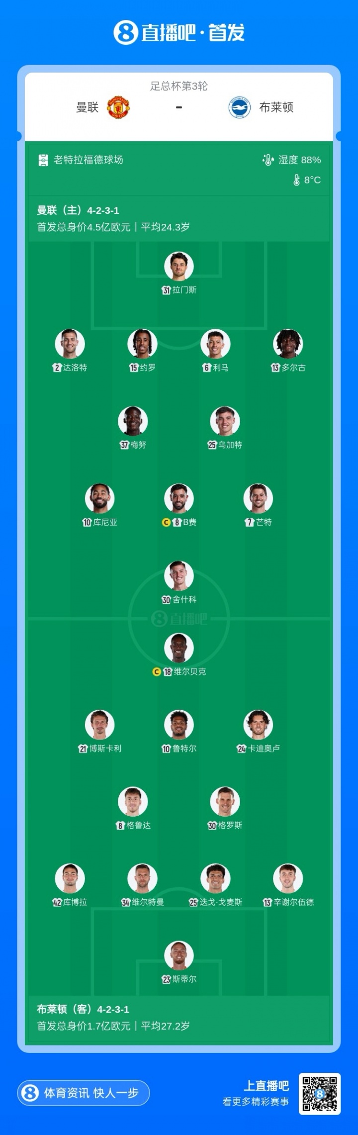 曼联vs布莱顿首发:梅努先发,舍什科、库尼亚出战,卡塞米罗替补