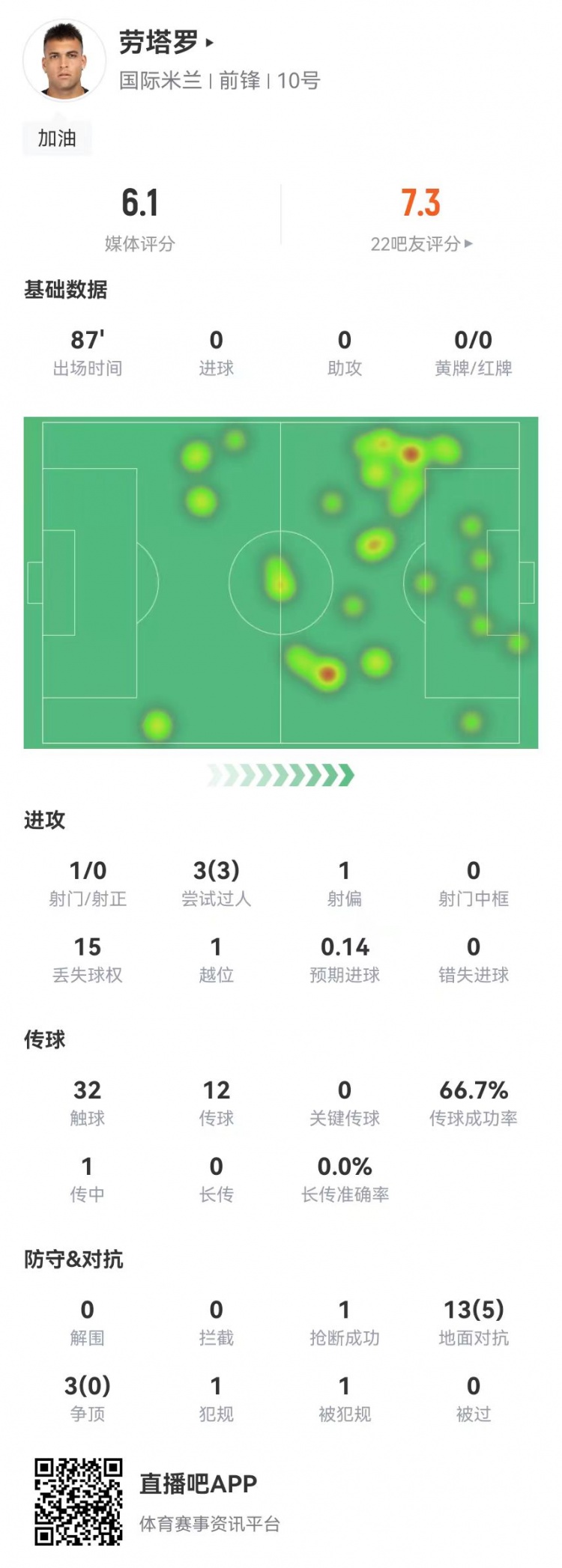 劳塔罗本场1射0正+15丢失球权 3过人3成功+16对抗5成功 获评6.1分