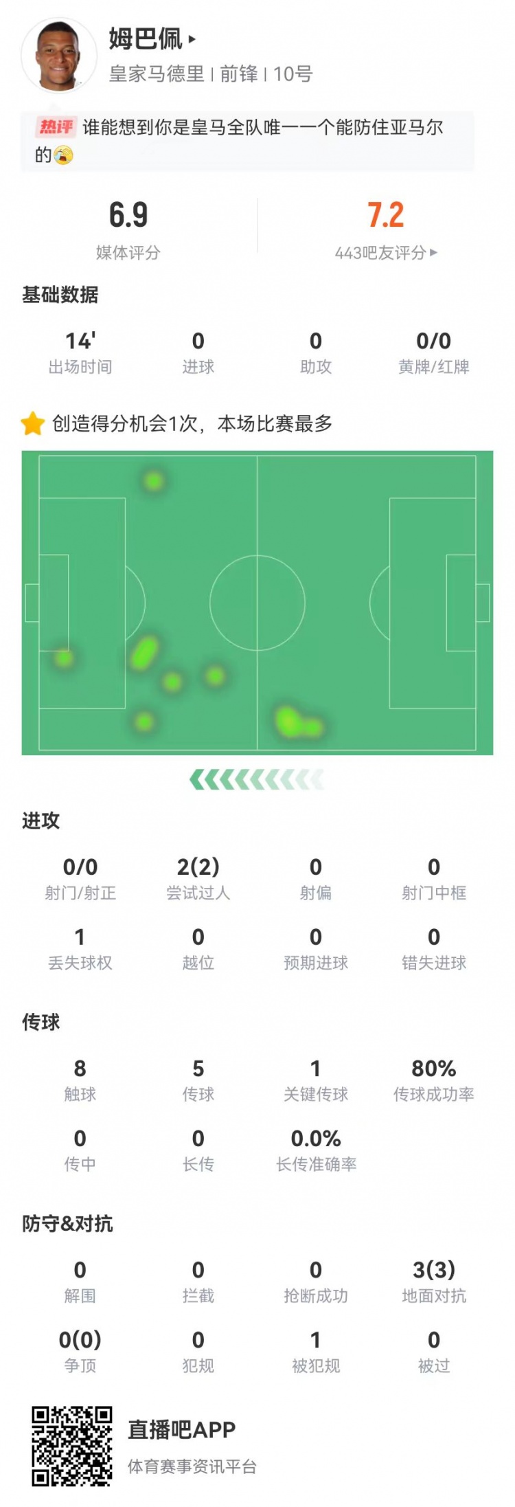 姆巴佩本场替补0射门 2过人2成功+1关键传球+1造犯规 获评6.9分