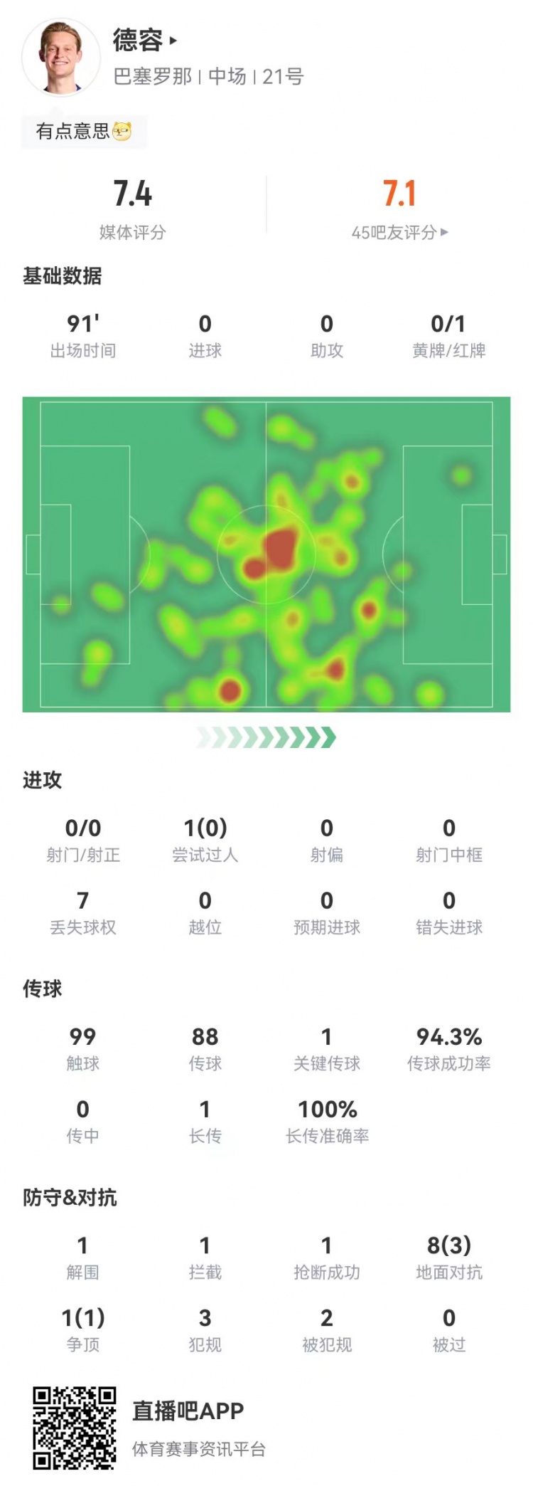 1月12日讯 巴萨在本轮西超杯对阵皇马,德容本场数据如下: