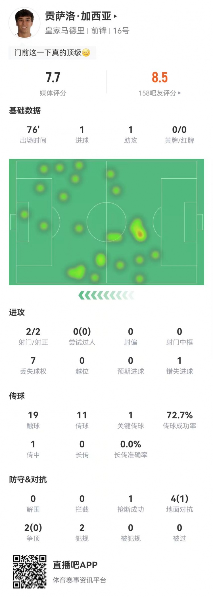 1月12日讯 皇马在本轮西超杯对阵巴萨,贡萨洛·加西亚本场数据如下:
