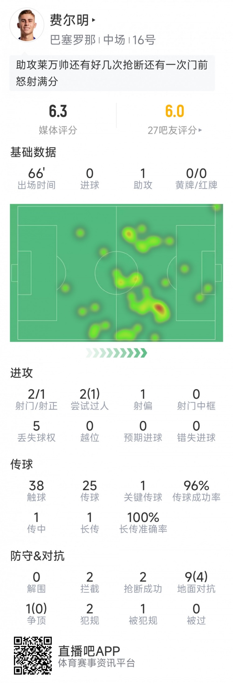 1月12日讯 在西超杯决赛巴萨对阵皇马的比赛中,费尔明送出助攻,以下为他在本场数据: