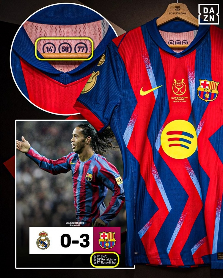 巴萨本场比赛球衣在领口位置印有14、58和77三个数字,这也被考证是2005年的国家德比3-0皇马一役的进球时间: