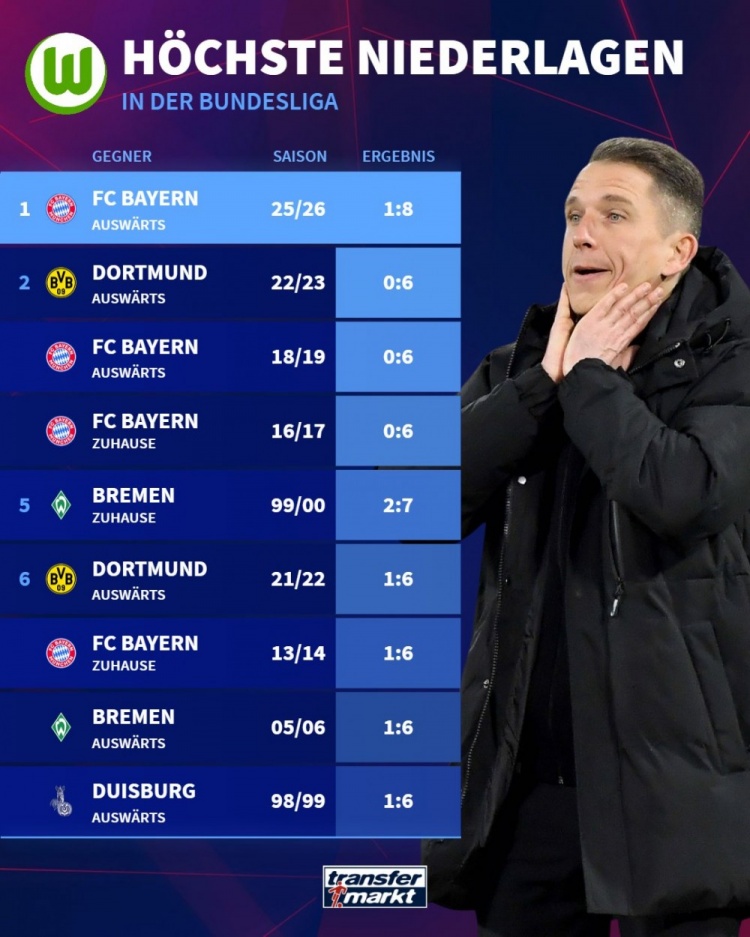 1月12日讯 本轮德甲焦点战,狼堡在客场1-8惨败拜仁,也创下了他们队史最大比分输球纪录。