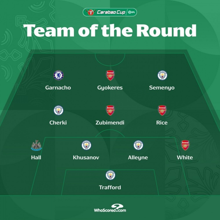 本周联赛杯最佳阵:塞梅尼奥领衔曼城5人,加纳乔、约克雷斯在列