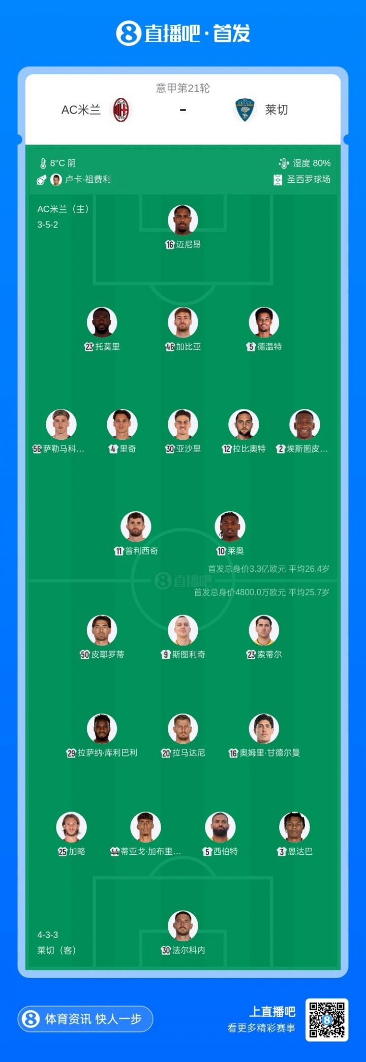 莱切首发:30-法尔科内、3-恩达巴、5-西伯特、44-蒂亚戈·加布里埃尔、25-加略、16-甘德尔曼、20-拉马达尼、29-拉萨纳·库利巴利、23-索蒂尔、9-斯图利奇、50-皮耶罗蒂