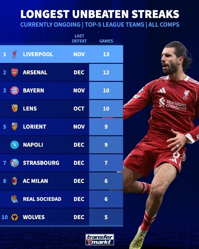 1月22日讯 在本轮欧冠,利物浦3-0完胜马赛,近13场各项赛事保持不败。德转盘点了目前五大联赛球队各项赛事现存最长不败场次榜,具体如下: