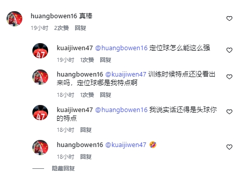 黄博文:训练时候特点还没看出来吗,定位球哪是我特点啊