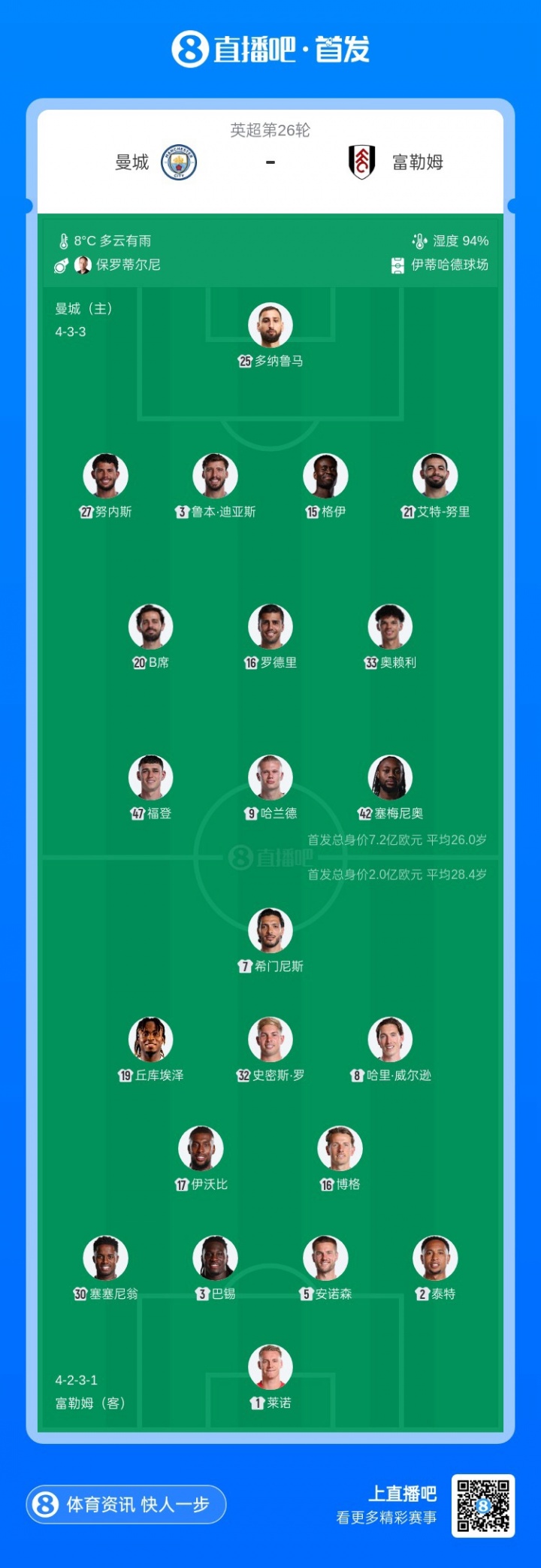曼城vs富勒姆首发:哈兰德领衔,福登、塞梅尼奥出战