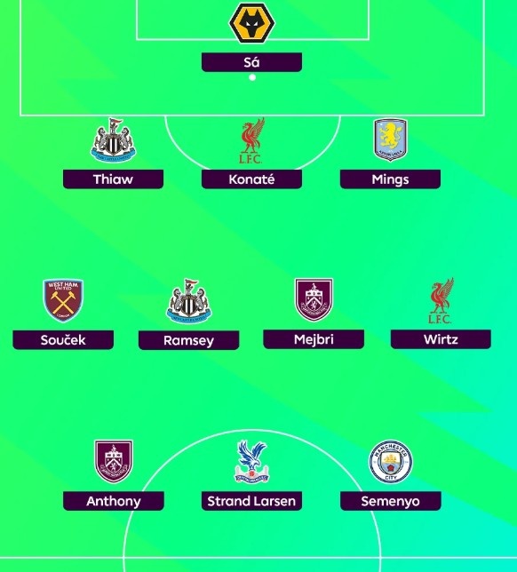 前锋:杰登·安东尼(伯恩利)、斯特兰德·拉尔森(水晶宫)、塞梅尼奥(曼城)
