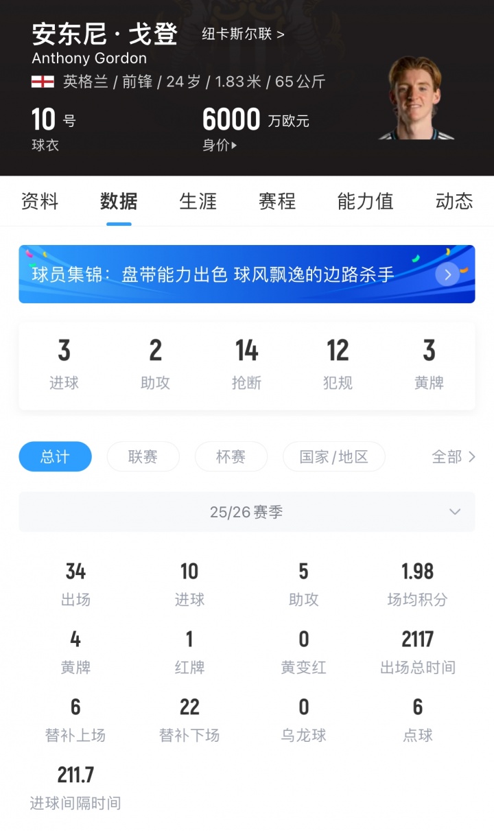 戈登现年24岁,他本赛季出场34次,贡献10球5助,现身价6000万欧。