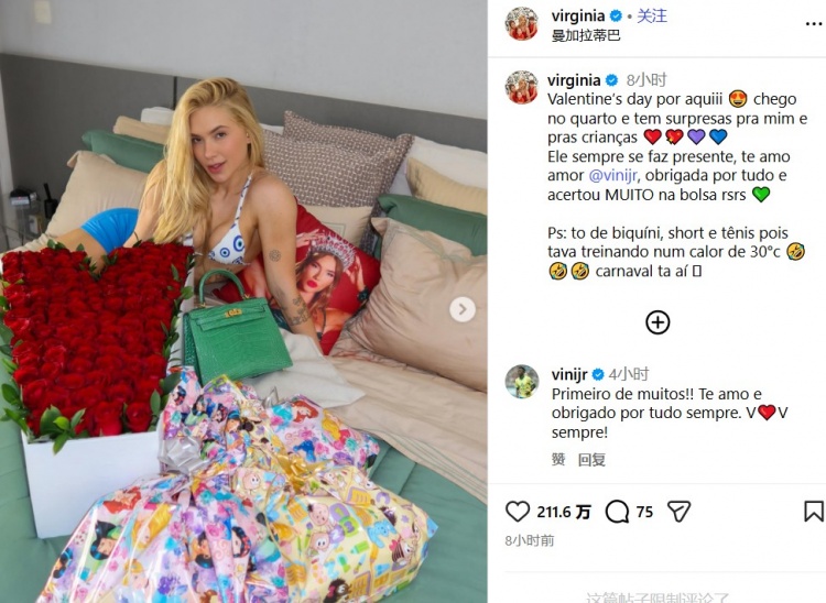 弗吉尼亚:情人节在这儿过,回到房间,发现为我和孩子们准备的惊喜,你总是时刻陪伴,爱你,亲爱的维尼修斯,谢谢你所做的一切,包包选得太准了哈哈。穿比基尼、短裤加运动鞋是因为我正在30℃的高温下训练,狂欢节就要到了。
