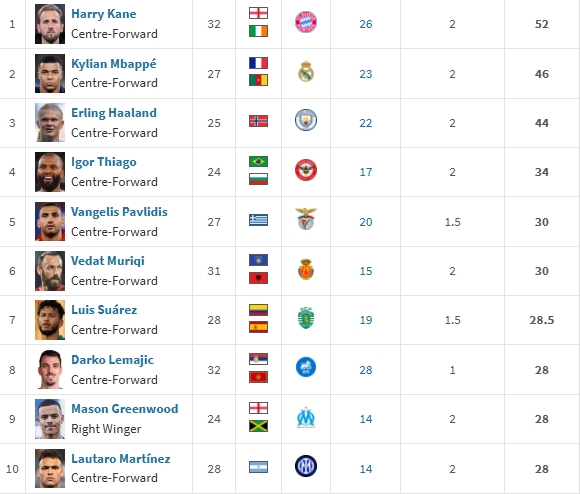 扩大优势!欧洲金靴排名:凯恩领跑 姆巴佩哈兰德二三 劳塔罗第10