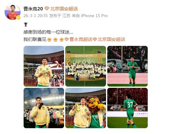 3月1日讯 在2026年“超级杯”的比赛中,北京国安2-0战胜上海海港,成功夺得冠军。比赛结束后,曹永竞更新微博庆祝夺冠,并表示“感谢到场的每一位球迷…我们联赛见”。