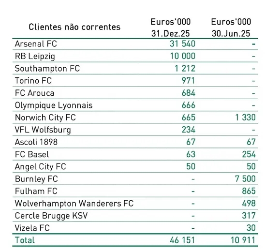 根据公开信息,截至去年12月31日,葡体已经实际到账约2000万欧元转会费,文件显示,阿森纳仍需向葡萄牙体育支付接近4700万欧元的转会费。未来一年内(流动款项),阿森纳需支付1546.8 万欧元,阿森纳还要在超过一年的未来支付(非流动款项)3154万欧元。